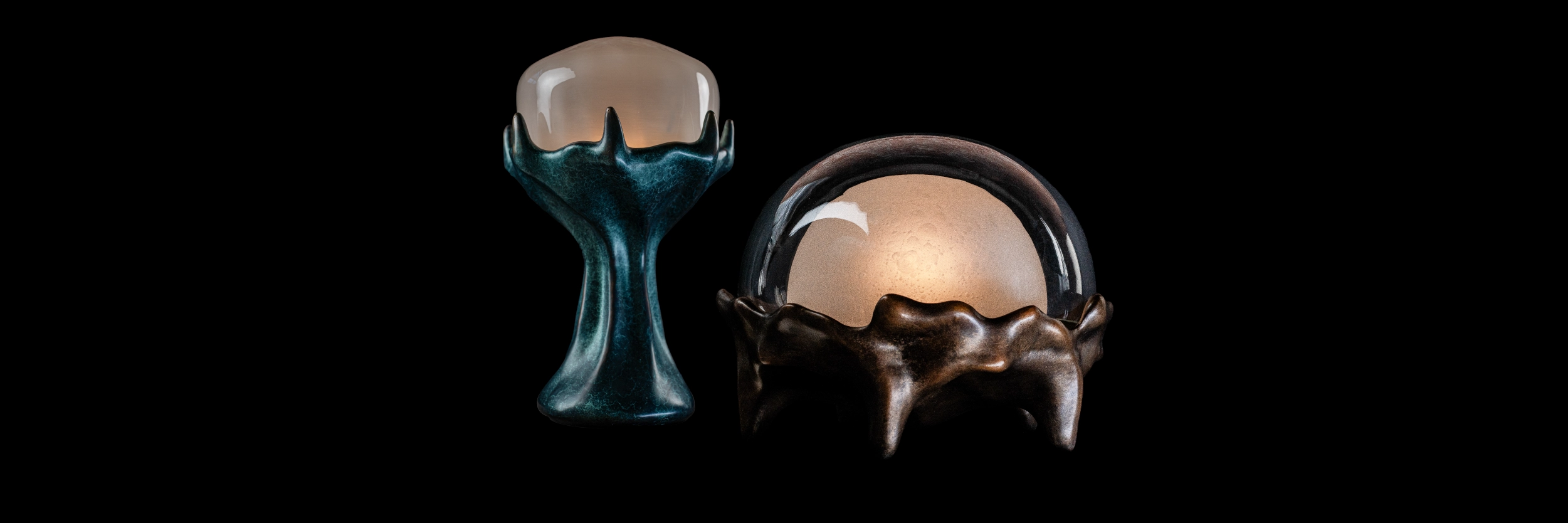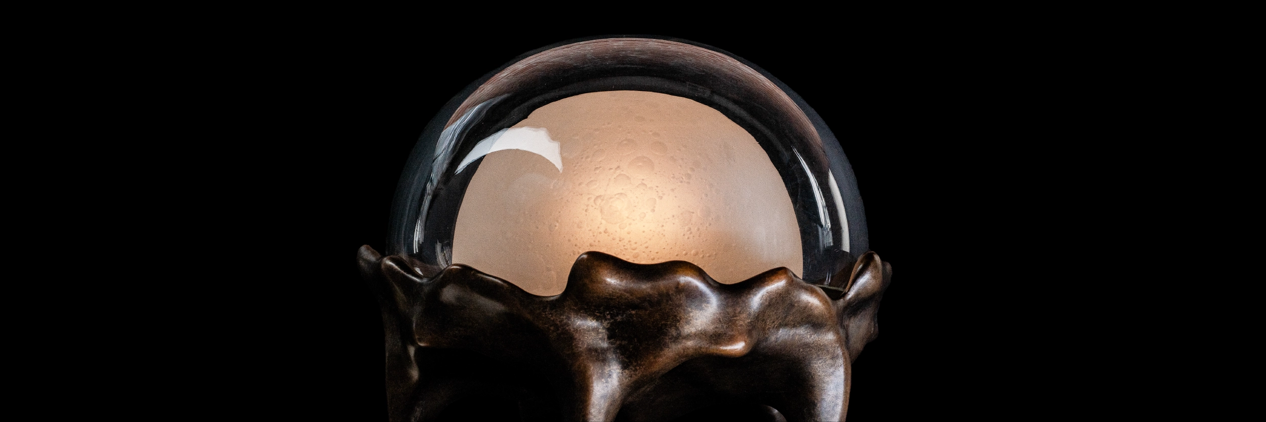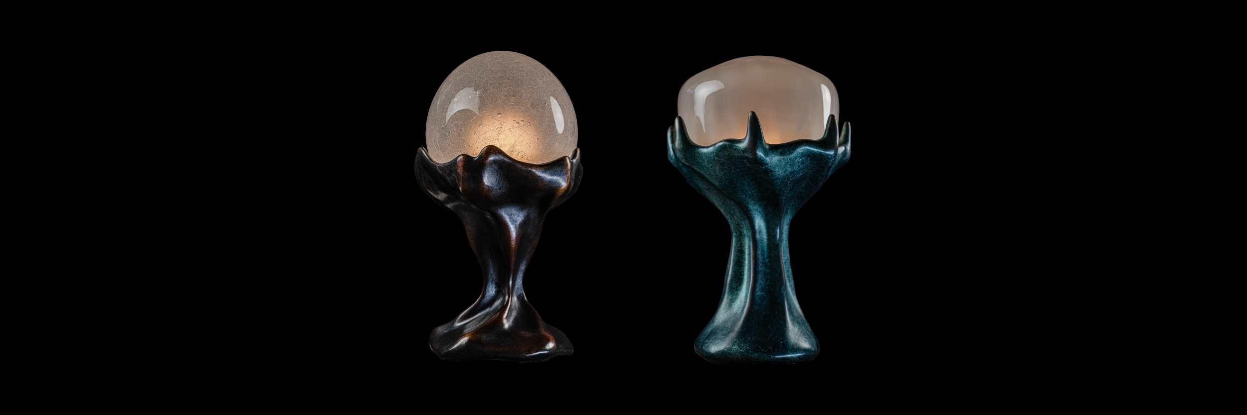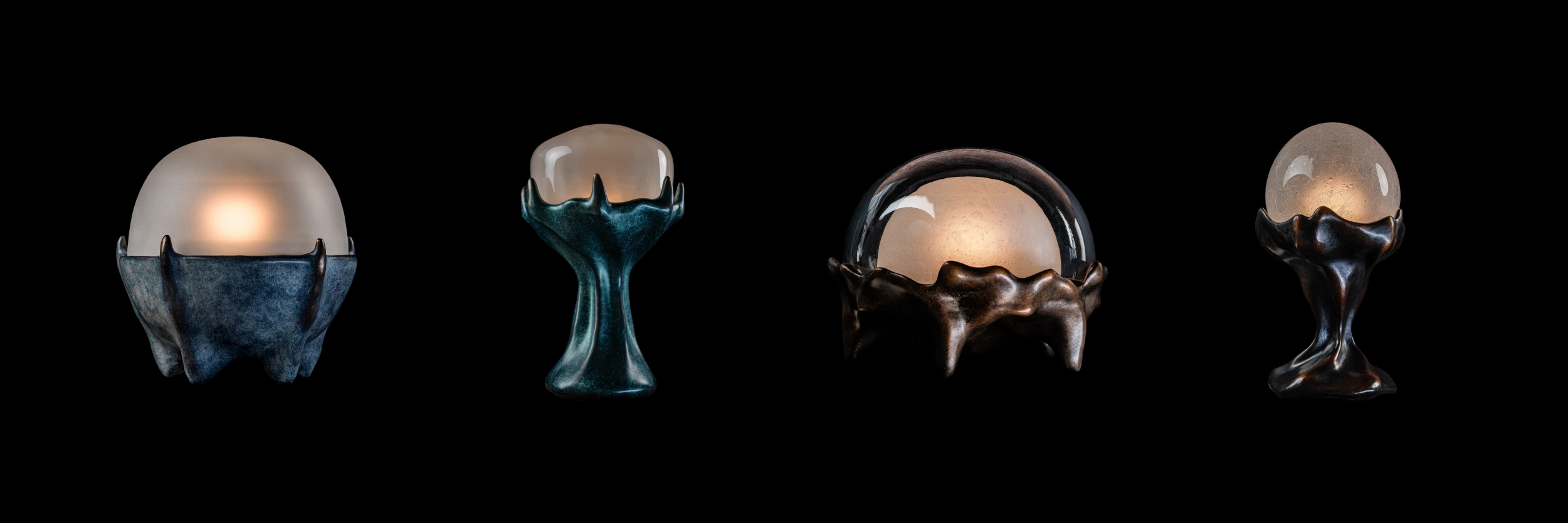 The inaugural LUMARA Collection introduces these forms through illumination. Inspired by lunar caves and atemporal rock formations, each work evokes the quiet suggestion of life blooming in the unlikeliest places. Sculpted in bronze and glass, the pieces capture a dialogue between the organic and the otherworldly—botanical, mineral, and something in between. Through light, Curry reveals the delicate resilience and transformative energy embedded within his imagined terrain.