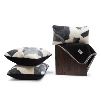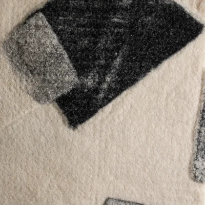 On a creamy white felted wool base, a mix of charcoal and white pre-felted and hand cut wool pieces are laid out by hand in a patchwork pattern. No two inches alike. Color and pattern will vary as our fabrics are hand designed.
