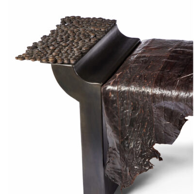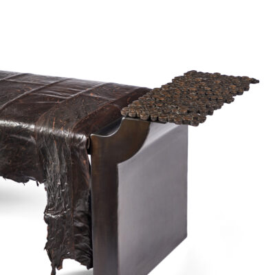 Bench in bronze, patinated steel, and goat hide. From the Armor Amor Collection. Edition of 50 + 1 AP.