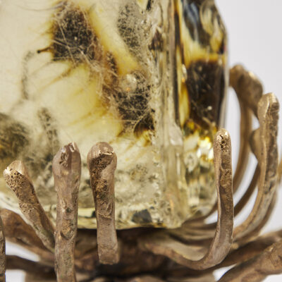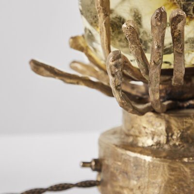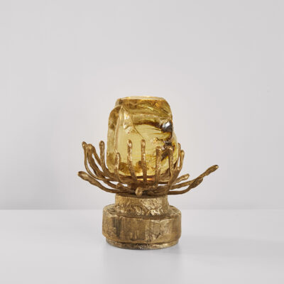 Table lamp with slag glass in amber resting on hand-cut segmented brass base with LED light.