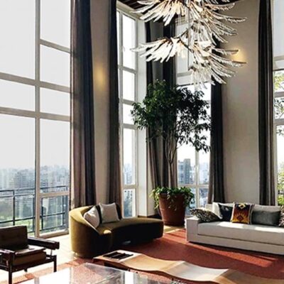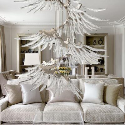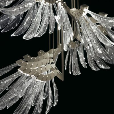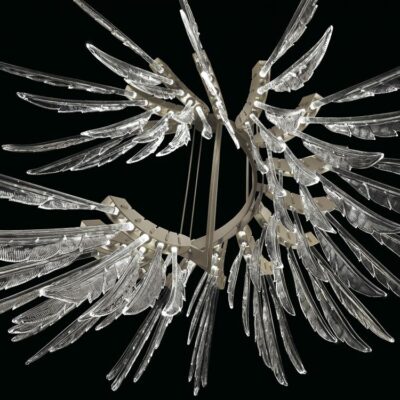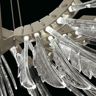 Angel is a spiral of crystal plumage, which wraps around itself with dynamism and floats in space like a vaporous wing unfolding lightly. Each feather is lit by led, as well as the ceiling connection.