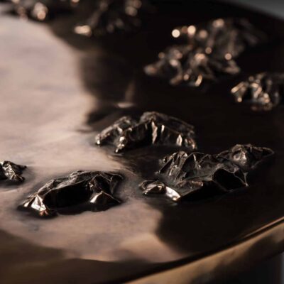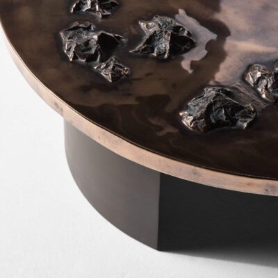 Archipelago is serene, yet imposing; elegant while retaining a certain brusqueness; decidedly referential and at the same time holding an undeniable industrial fluency. Each mountain crest is hand carved in wax before being cast in bronze and affixed to bronze sheet, then welded, sanded, polished, and patinated to achieve a seamless topography. The hundreds of hours of handwork and light mottling of the patina imbues each piece with an ineffable atmosphere. Made in collaboration with Nick King.