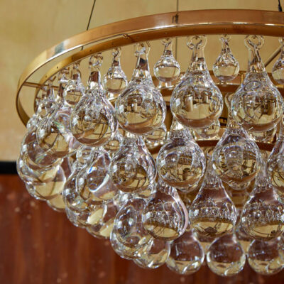 Polished nickel or patinated bronze frame with solid clear or mercury glass drops.