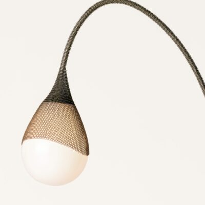 A hand-blown glass pendant hangs from an elegant, arcing curve – both cloaked in chainmail to strike a balance between strength and delicacy. A rectangular base grounds the lamp, featuring a dimmer knob to control the luminescent glow.