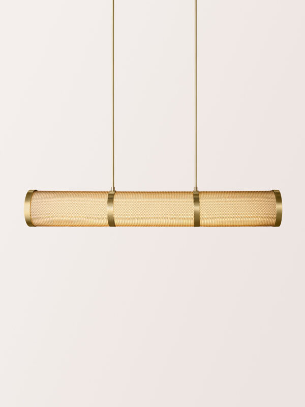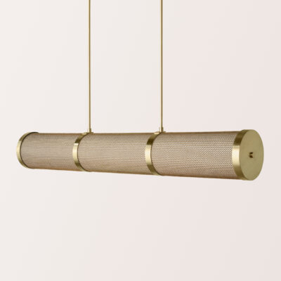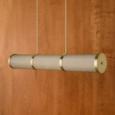 The Armor Linear features a linen shade cloaked with chainmail, creating a layered interplay of texture and diffused light.