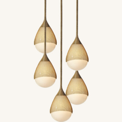 The Armor Pendant features a carefully crafted hand-blown glass pendant draped with finished stainless steel chainmail. Pulling from the intricate use of chainmail in Medieval armor, we reinterpret its materiality by creating a balance between the strength that the metal mesh evokes and the delicate and elegant nature of hand-blown glass. Available in two sizes as a single pendant, a cluster of three or five pendants, or a custom cluster.