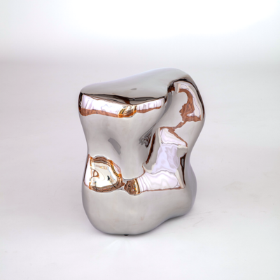 The stand’s mirror-polished surface captures and reflects its environment with an almost liquid quality. The object merges the elegance of a digital ideal with the imperfections of the physical world, creating a piece that serves both as a functional object and a contemplative art form.