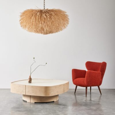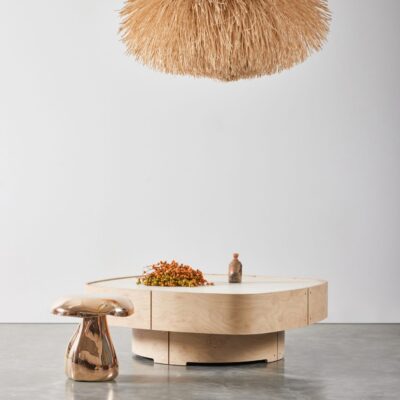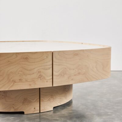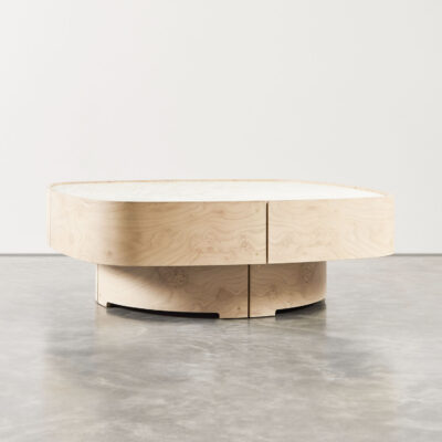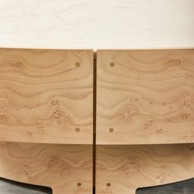 Carpathian burl-elmwood veneer in rounded quadrants with inset travertine, on pedestal base with forged brass pins. The veneer is bleached and waxed.