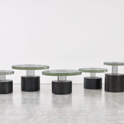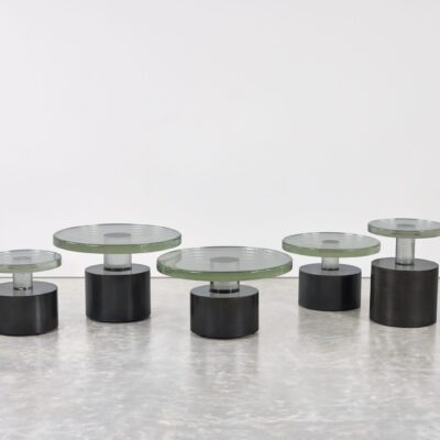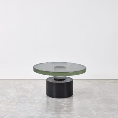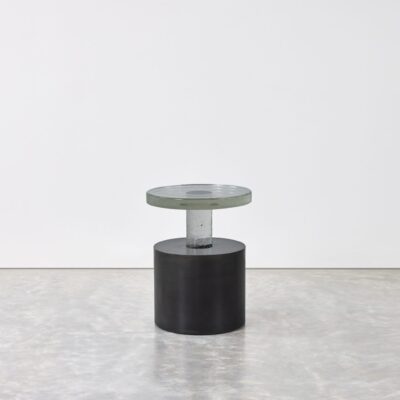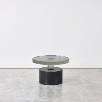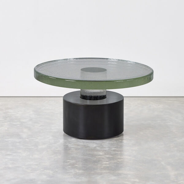 Cast glass table with cylindrical steel base and leveling feet. Available in multiple sizes.