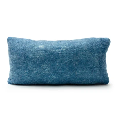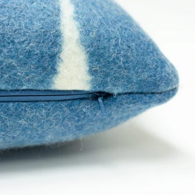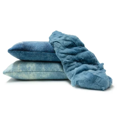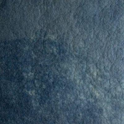 Indigo plant-dyed carded Merino wool hand "glazed" over a canvas of cream Perendale wool, this felted wool fabric has the shimmery blues and underlying cream tones reminiscent of water. Colors vary due to natural fibers and Botanical dyeing process. Seasonal availability.