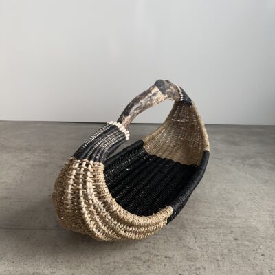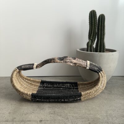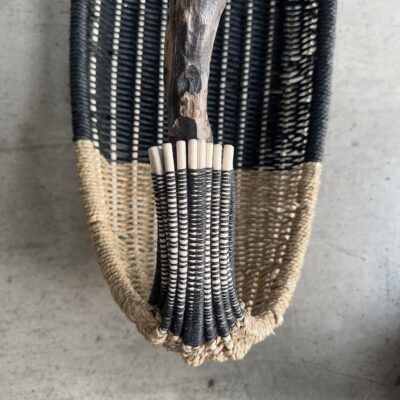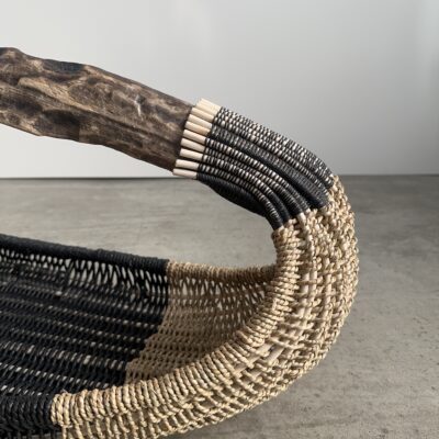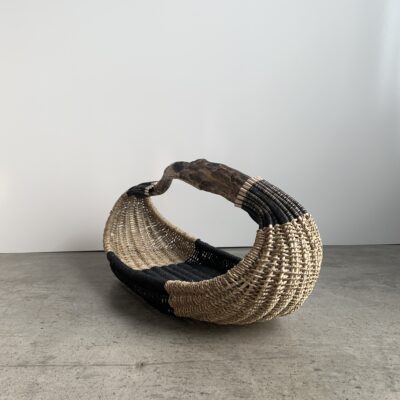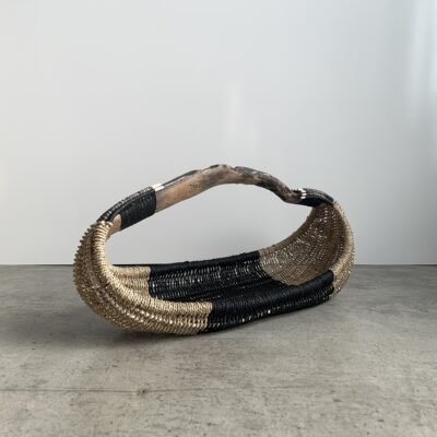 Basket made of California coast driftwood, reed, seagrass rope, black Danish cord, waxed linen cord.