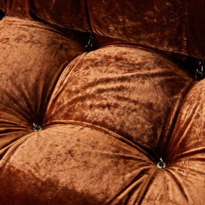 Modular tufted sofa with tie rods and rings. Upholstered in Rust Velvet by COUP STUDIO Fabrics.