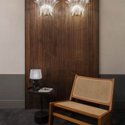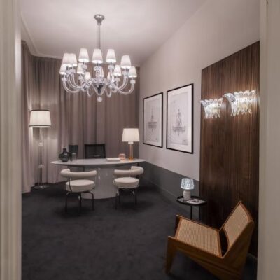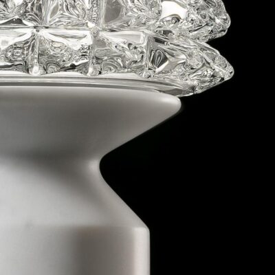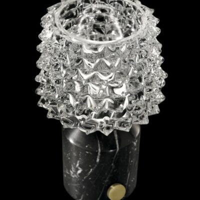 Camparino is an elegant, sophisticated wireless table lamp that brings together past and present in a single, compact piece. On the one hand it reflects Murano glassmaking tradition, in that it uses the “rostrato” technique; on the other, it represents the ultimate in modernity: its rechargeable lithium battery allows it to be transported anywhere. It can be turned on or off and its brightness adjusted with just a movement of the brushed brass dimmer control knob. The base is in precious marble, in two options: White Carrara and Belgian Black.