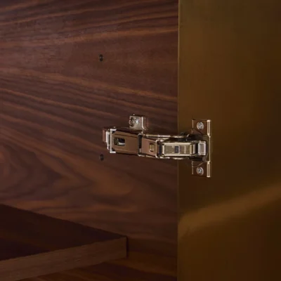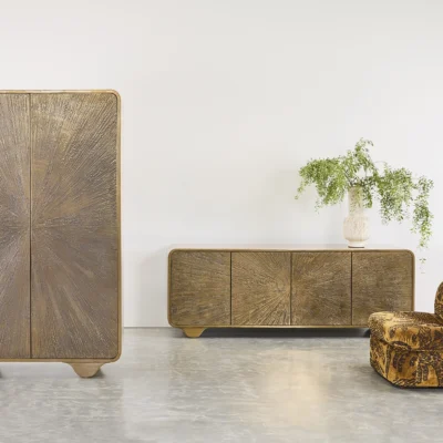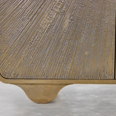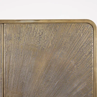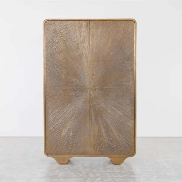 Hand-applied lacquered resin finish with scribed starburst pattern detail on front doors on rolled wave base. The resin lacquer is atomized with real metals and will age and patina over time creating a warm finish.