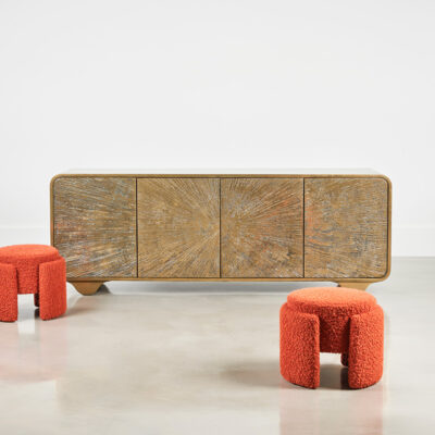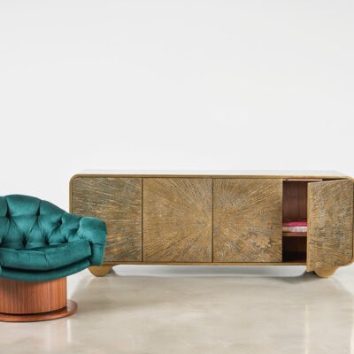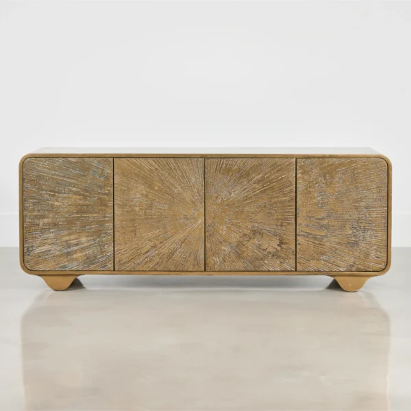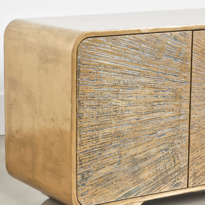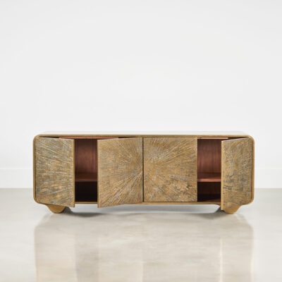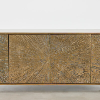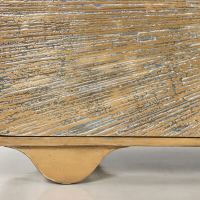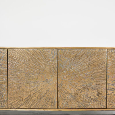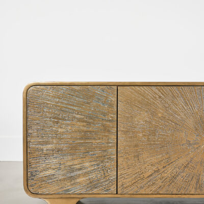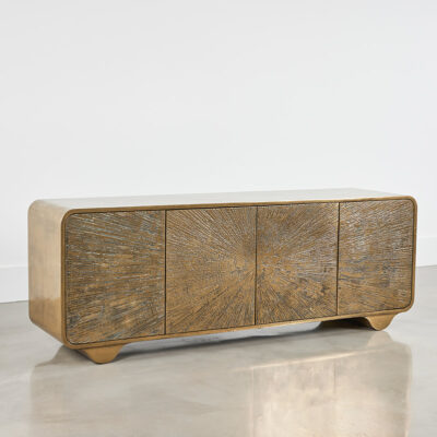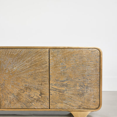 Hand-applied lacquered resin finish with scribed starburst pattern detail on front doors on rolled wave base. The resin lacquer is atomized with real metals and will age and patina over time creating a warm finish.