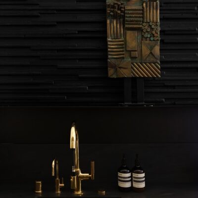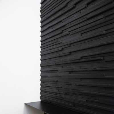 Wall panels constructed from blackened steel and Charred or Wire Brushed reclaimed wood. Inspired by the Japanese method of charring cedar shingles to create a weather resistant veneer.