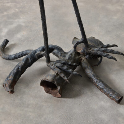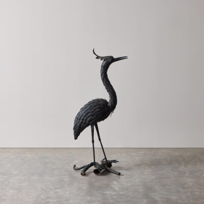 Wrought iron sculpture of stork on branches.