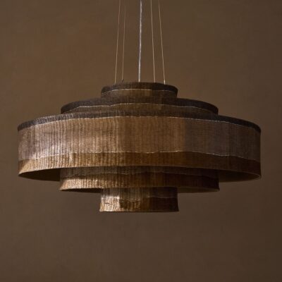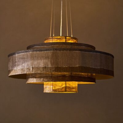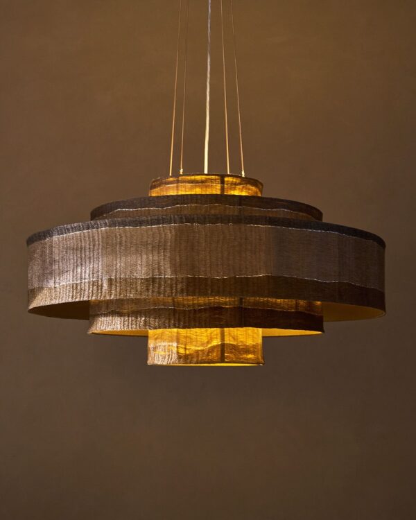 Three concentric tiers of woven metallic fabric over stretched silk, with base diffuser. Made in collaboration with textile designer Anne Corbiere.