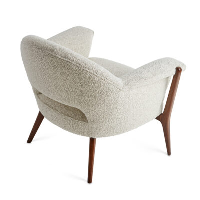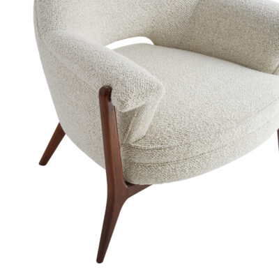 Upholstered arm chair with exposed wood frame.