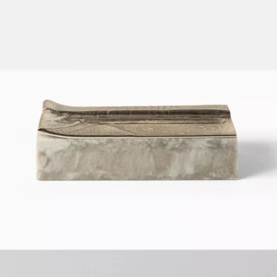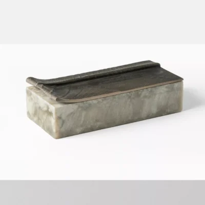 Cofre Box No. 2 is a rectangular cast mineral vessel and a cast bronze top modeled with an armadillo shell texture. With a pen-scaled depression on the top, the piece is designed to hold writing instruments.