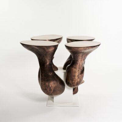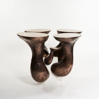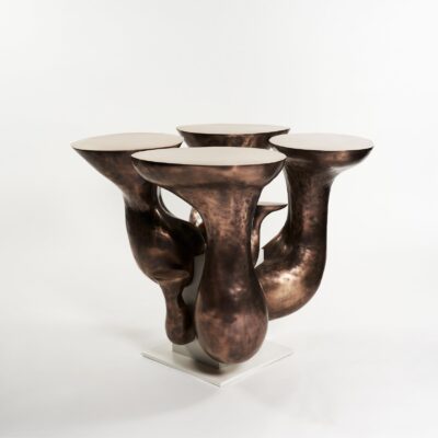 Composition in D is an arrangement of forms inspired by classical music and the fungus kingdom. Abstract, mushroom like forms spawn from clean white rectinearity. The fully grown hammered bronze forms rise up to form a table surface, while the adolescents prod the space around them. The piece may keep growing, the fruits expanding outwards and upwards until there is no white box left at all. All growth is also destruction, all clarity also obscuring. Meticulously planned and crafted to achieve a sense of chaos and chance, to capture a moment in time and to tell a story that reaches beyond time, the table embodies the primeval forces of our world.