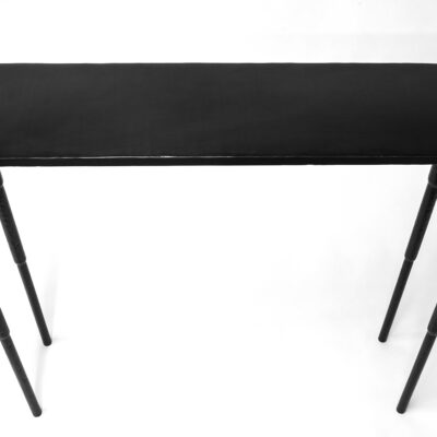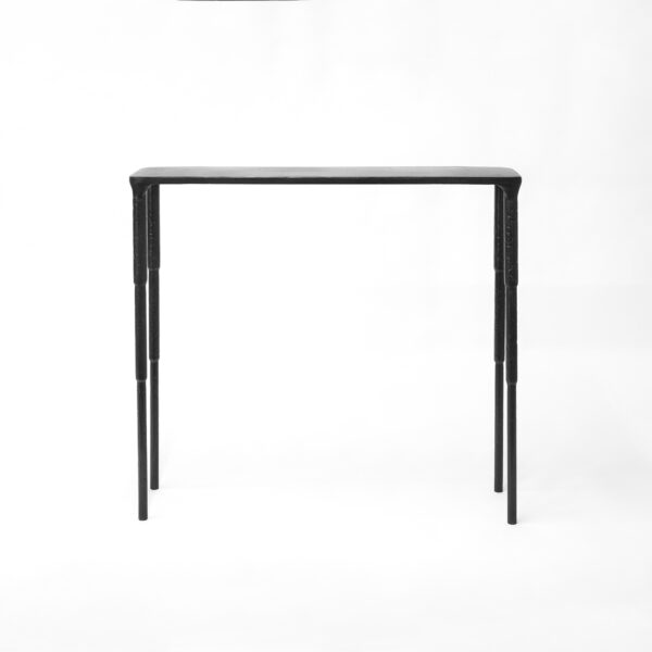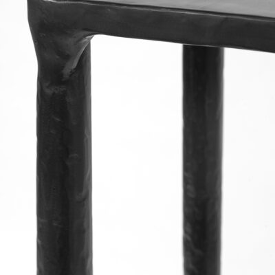 A refined and sleek design, this console table is carved out of blackened and waxed steel. Horsehair accents help enhance the intrigue of the table.