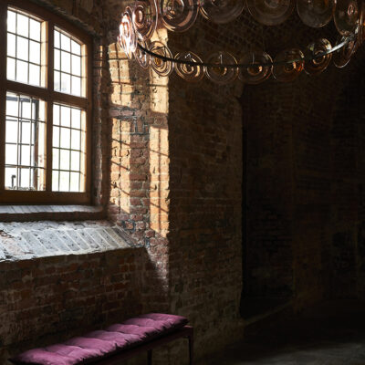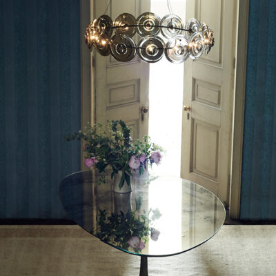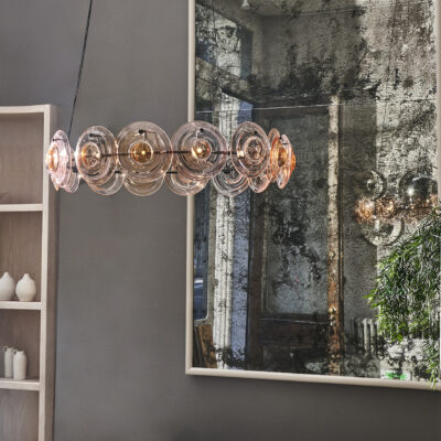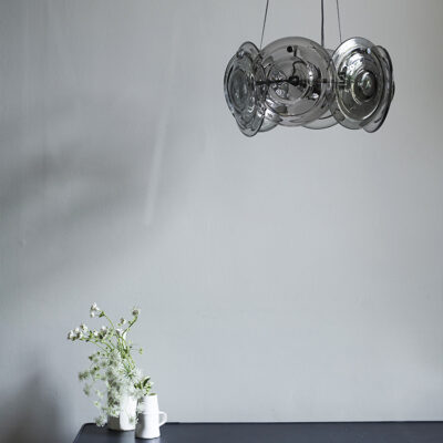 Solid colored hand blown glass discs in ash or coral, illuminated by LED with blackened nickel frame.