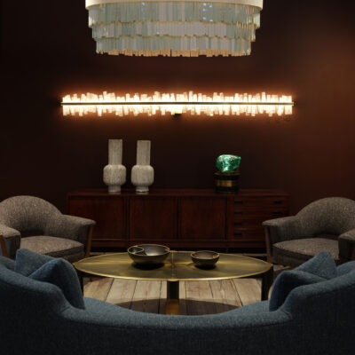 Table lamp with slag glass in emerald resting on hand-cut segmented brass base with LED light.