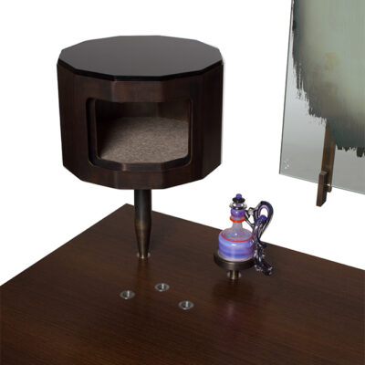 The Datum Vanity and Chair is constructed of Wenge, Bronze, Patinated Steel and Leather. Featuring a Hand Silvered Mirror, Perfume Bottle and Jewelry Case. One of a Kind.