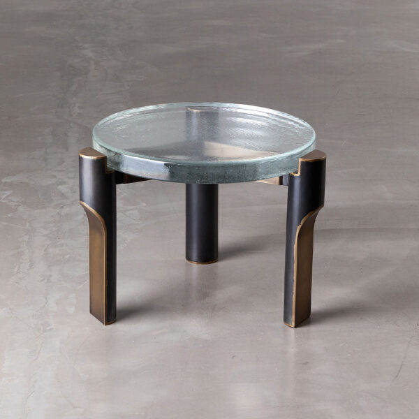 Satin brass, brass with hand rubbed bronze patina, and blackened steel with cast glass top.