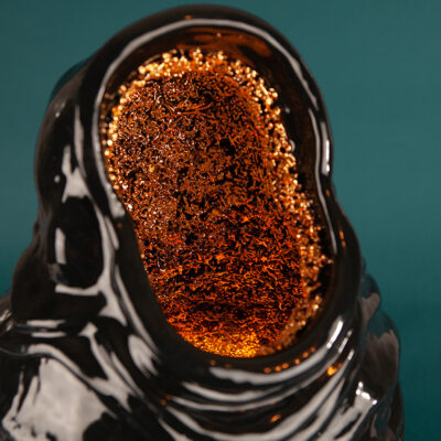 Part of Daniel's "Familiar Souls" series. "Doug" stands pridefully at 20" high and 16" wide. The classic loyal soul, Doug spends his time anticipating other's interactions. Doug's comfort with his flappy physique is apparent in the glossy black glaze he chooses to adorn. His large mouth signifies openness and is seen as a sign of vulnerability among the soul community. The light source surrounded by thousands of 24k gold extrusions buried within is designed to invite further connection. While part of a series, Doug is one of a kind.