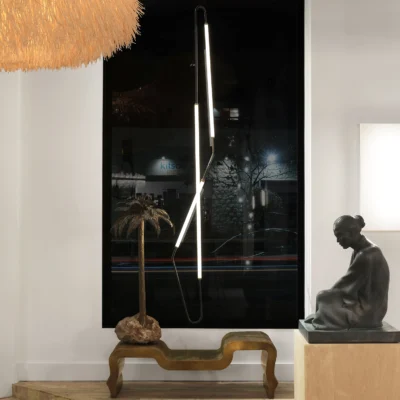 The Equinox Chandelier is a nod to kinetic 20th-century modern lighting with a hand-formed metal frame, reeded or smooth glass tubing, and hand-poured resin LED diffusers. A refined study of lines and sinuous curves, the Equinox is available in a wide variety of sizes and finishes. Installation by the artist’s studio or by an expert installer with remote support is recommended.
