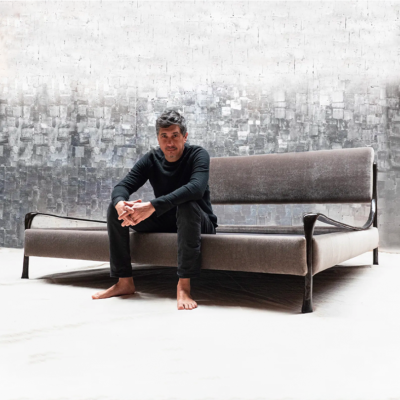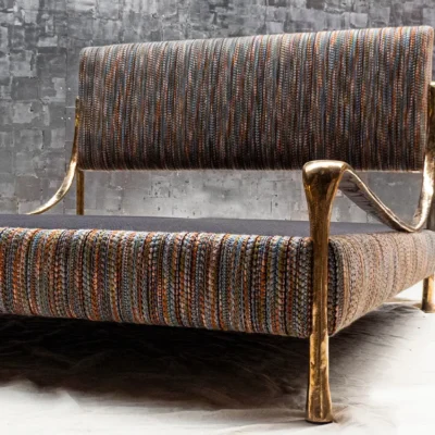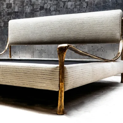Upholstered bed with hand cast silicon bronze frame.