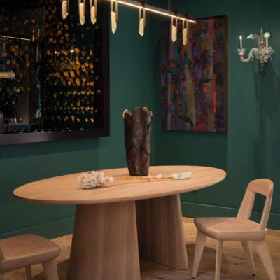 Los Angeles-based artist Leslie Nix is known for her singular personal style. With an interest in transformative materials, her process relies on experimentation, working in the mediums of oil on canvas, bronze, and glass. Her paintings, sculptural lamps, and decorative objects are influenced by her travels, including experiences in Africa. Nix received her BFA from the Savannah College of Art and Design.