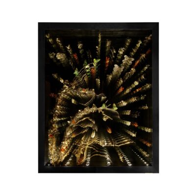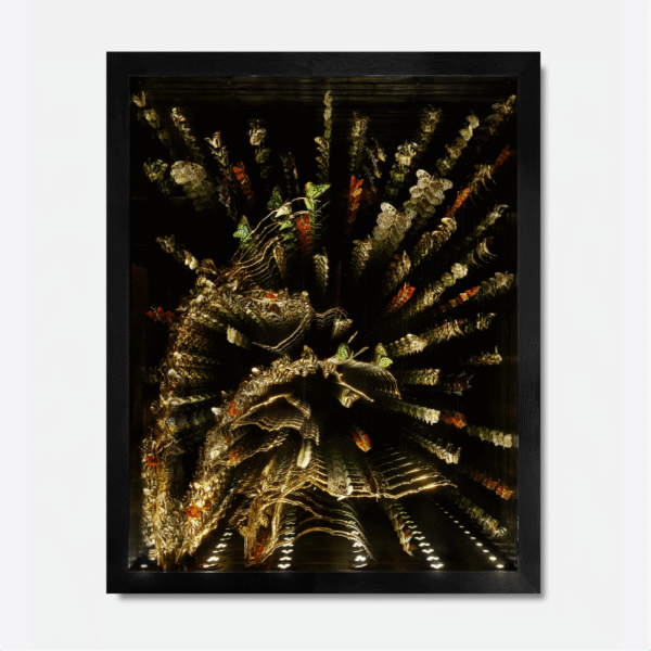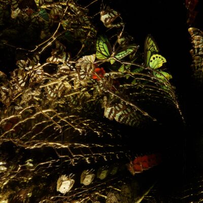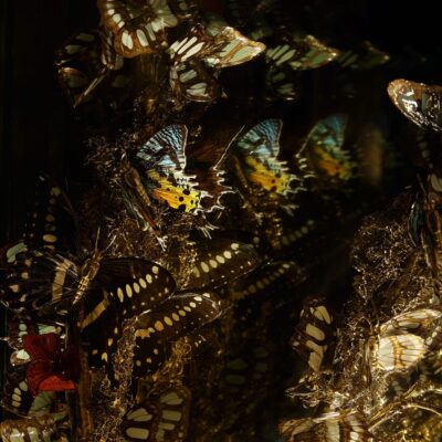 A reflection on the tension between industry and nature, and the balance we hope to strike between the two. Hand-strung butterflies made from real butterfly wings and plated bronze bodies.