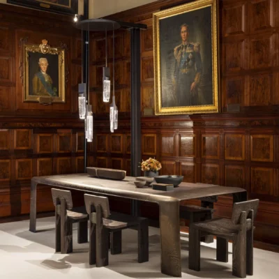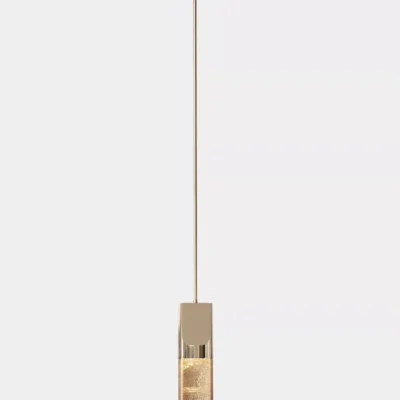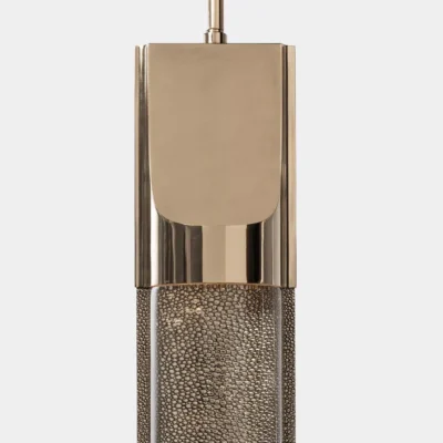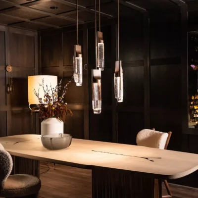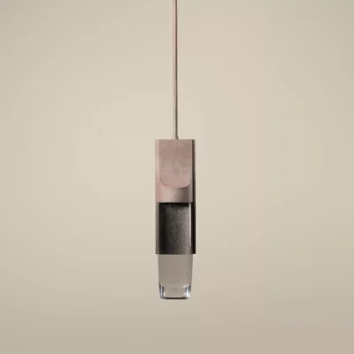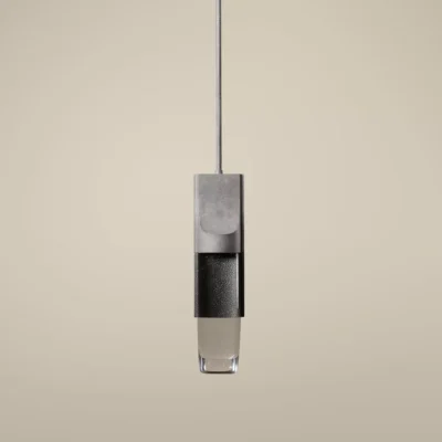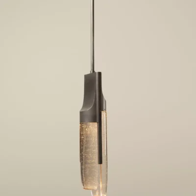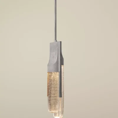 An isthmus is a narrow piece of land connecting two larger areas across an expanse of water by which they are otherwise separated. This delicate separation is the spirit of the Isthmus series. The hand-polished cast glass components of the Isthmus Pendant are held by an asymmetric bronze structure from above. No angles are the same, as the lenses distort the cast bronze shagreen texture in between.