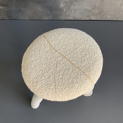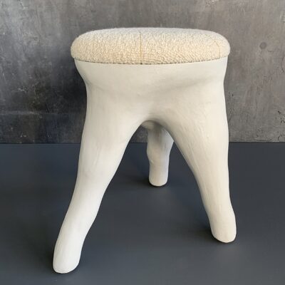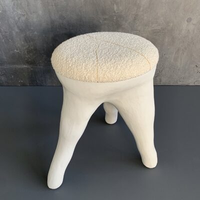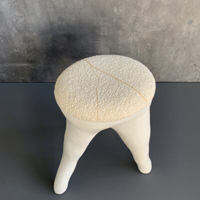 Waxed white concrete stool with upholstered cushion embroidered with ochre and gold thread detail.