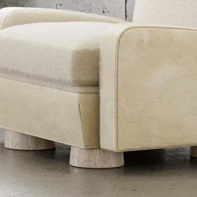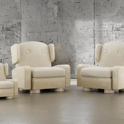 The L’Elephante Chair is a playful take on a classic wingback chair that is generously proportioned and exceptionally comfortable. This design balances form and function in a timeless silhouette that gives a playful nod to its namesake with the textural materials and Art Deco inspired eyes.