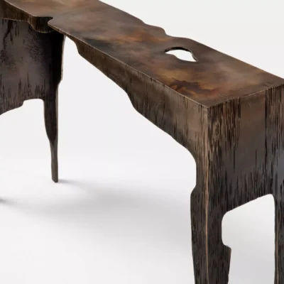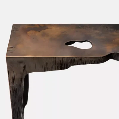 The Loma Console is a sculptural table entirely cast in bronze. With diverse form features on every side, it can be oriented alternatively. and continuous discovery as well as serving as a canvas to explore time-evolving patinations. and continuous discovery as well as serving as a canvas to explore time-evolving patinations.