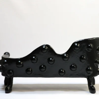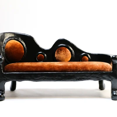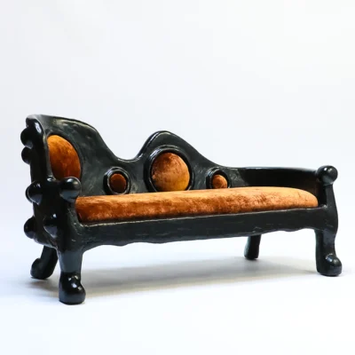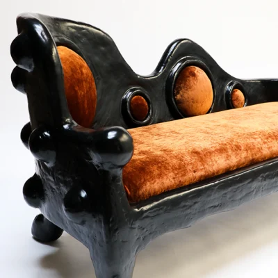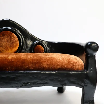 The Lyman Settee is made from a complex plaster, pulp, and black paint mix and upholstered in a rust velvet by COUP STUDIO FABRIC.