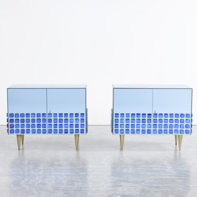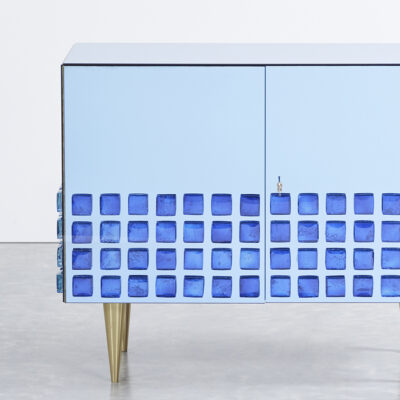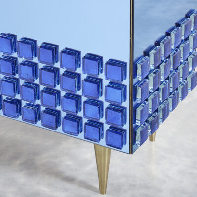 This mirrored two-door cabinet features a bold, modern design with a vibrant blue grid detail along the lower portion, adding texture and depth. Inside, a single glass shelf provides functional storage while maintaining a clean and minimal aesthetic. Elevated on tapered brass legs, the cabinet combines sleek surfaces with geometric accents, making it a striking yet practical addition to any space.