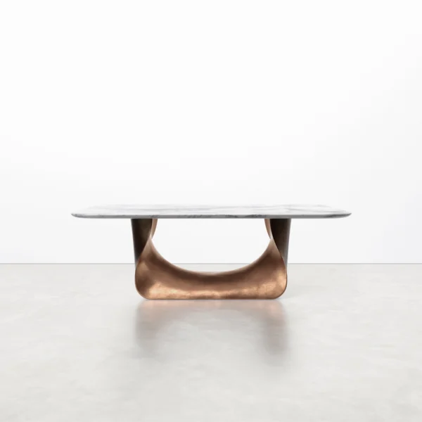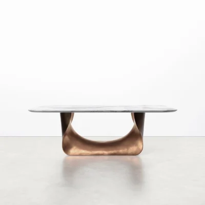 The collection is available in several sizes and finishes, offering a testament to both nature’s grandeur and artisanal innovation. Tabletop options include walnut, oak, or stone, accommodating diverse aesthetic preferences.