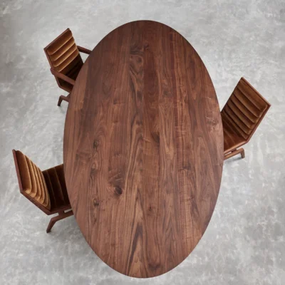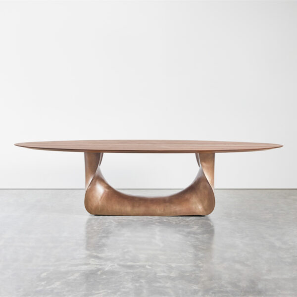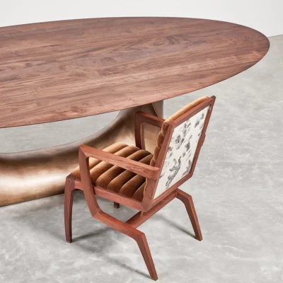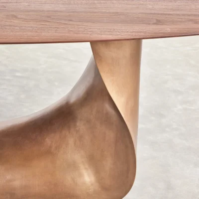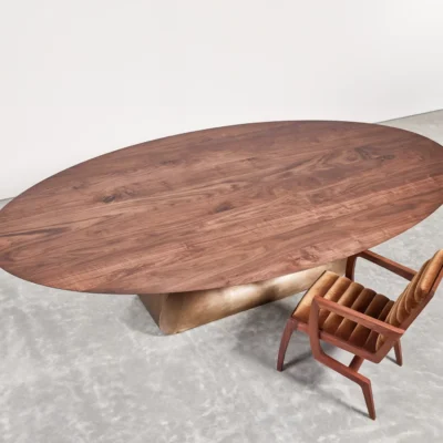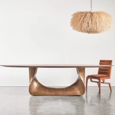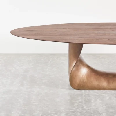 The collection is available in several sizes and finishes, offering a testament to both nature’s grandeur and artisanal innovation. Tabletop options include walnut, oak, or stone, accommodating diverse aesthetic preferences.