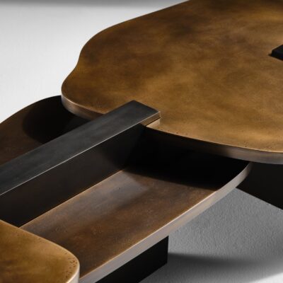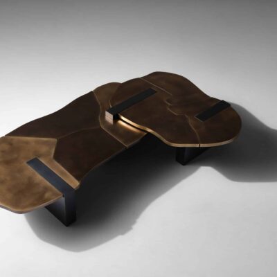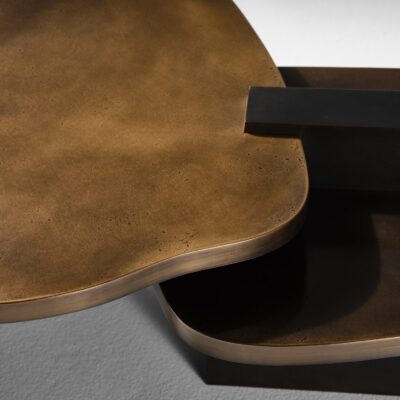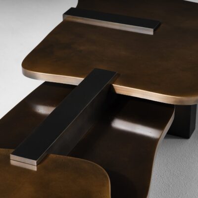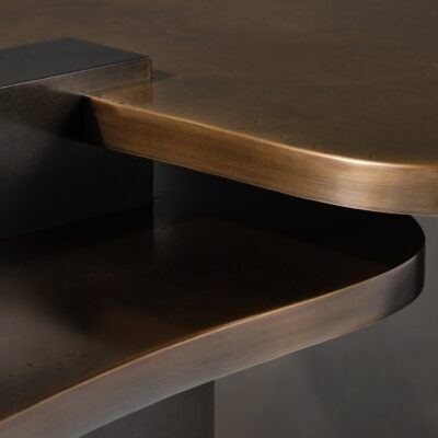 Bronze sheet is carefully cut into patterns and hand hammered for texture. Individual pieces are painstakingly welded, sanded then locked together creating a perfectly fitted whole. The soft edged pieces interlock into a minimal set of blocks that punctuate the Cartesian rhythm and juxtapose the large landscape-like tops that appear to float weightlessly.
