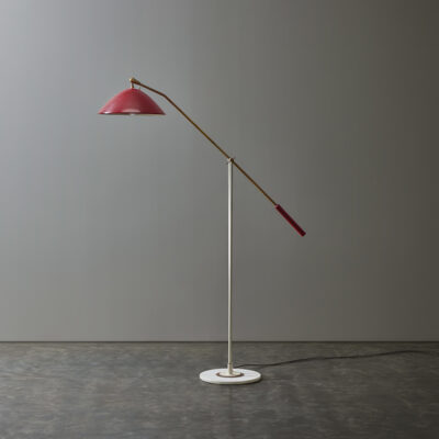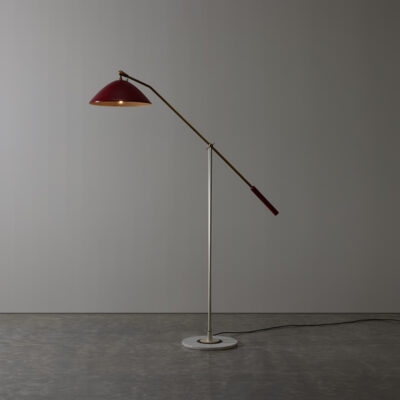 Polychrome adjustable floor lamp with rocking arm, polished brass neck on marble base.