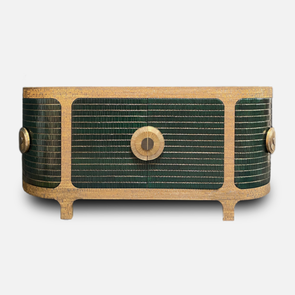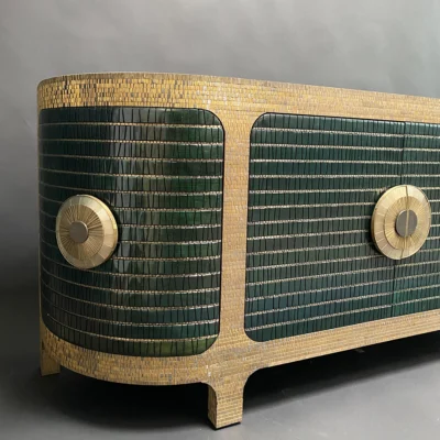 Sideboard with emerald green painted insets and antique mirrored top.