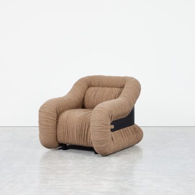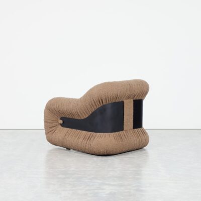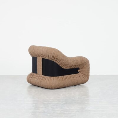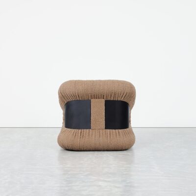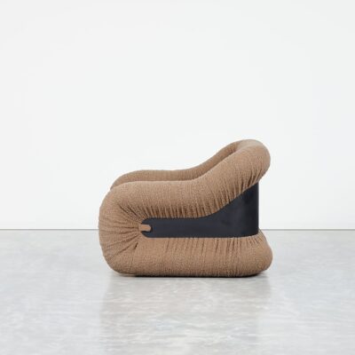 The Nuage Chair features a bold, sculptural design with soft, rounded forms and textured, ruched upholstery that adds depth and dimension. A sleek metal band cinches the chair at its center, creating a striking contrast and emphasizing its curvaceous silhouette.