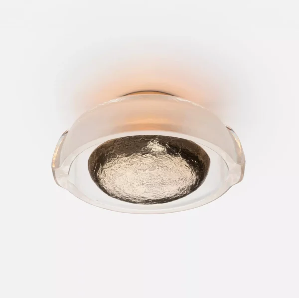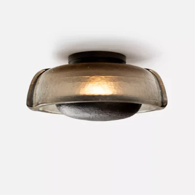 A ceiling mounted cast glass form, with exposed bulb or with an anchored cast bronze dome, the Okenite Ceiling Mount casts layered and nuanced light onto the ceiling surface. Glass is available with cast texture interior or with the interior surface etched. Available in a smaller size.