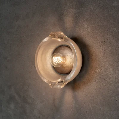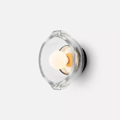A wall mounted cast glass form, with exposed bulb or with an anchored cast bronze dome, the Okenite Sconce casts layered and nuanced light onto the wall surface. Glass is available with cast texture interior or with the interior surface etched. Available in a smaller size.