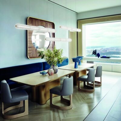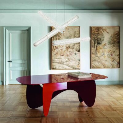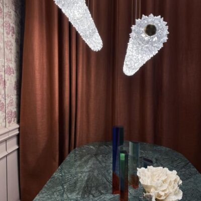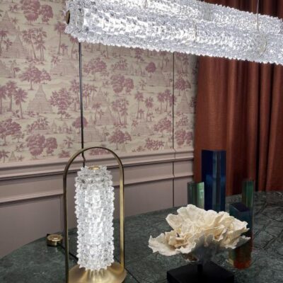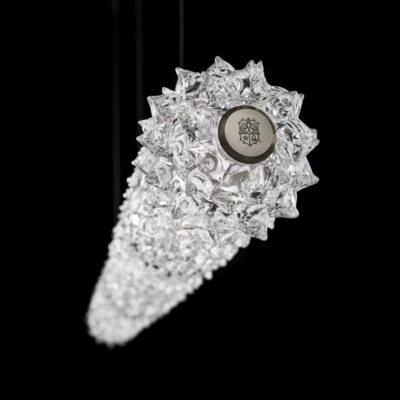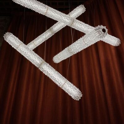 Inspired by the Opéra Garnier, it stands out for its eclectic, decorative character, expressed in stylistic mixtures and remarkable compositional balance. The references to a certain Baroque splendour are tempered by more minimal, contemporary touches, generating a delicate, harmonious dichotomy. The design challenge was to bring out the artistry and heritage of the company, a repository of the art of glass for over seven centuries. The outcome of this creative effort is a timeless, elegant design, rich but not redundant, with a direct, incisive personality. The main feature chosen by Nigro for the collection is the rostrato. This complex technique of craftsmanship, patented by Barovier&Toso, was invented by Ercole Barovier in 1938 and consists of “freehand” shaping of Venetian Crystal to obtain a continuous series of multi-facetted prisms.